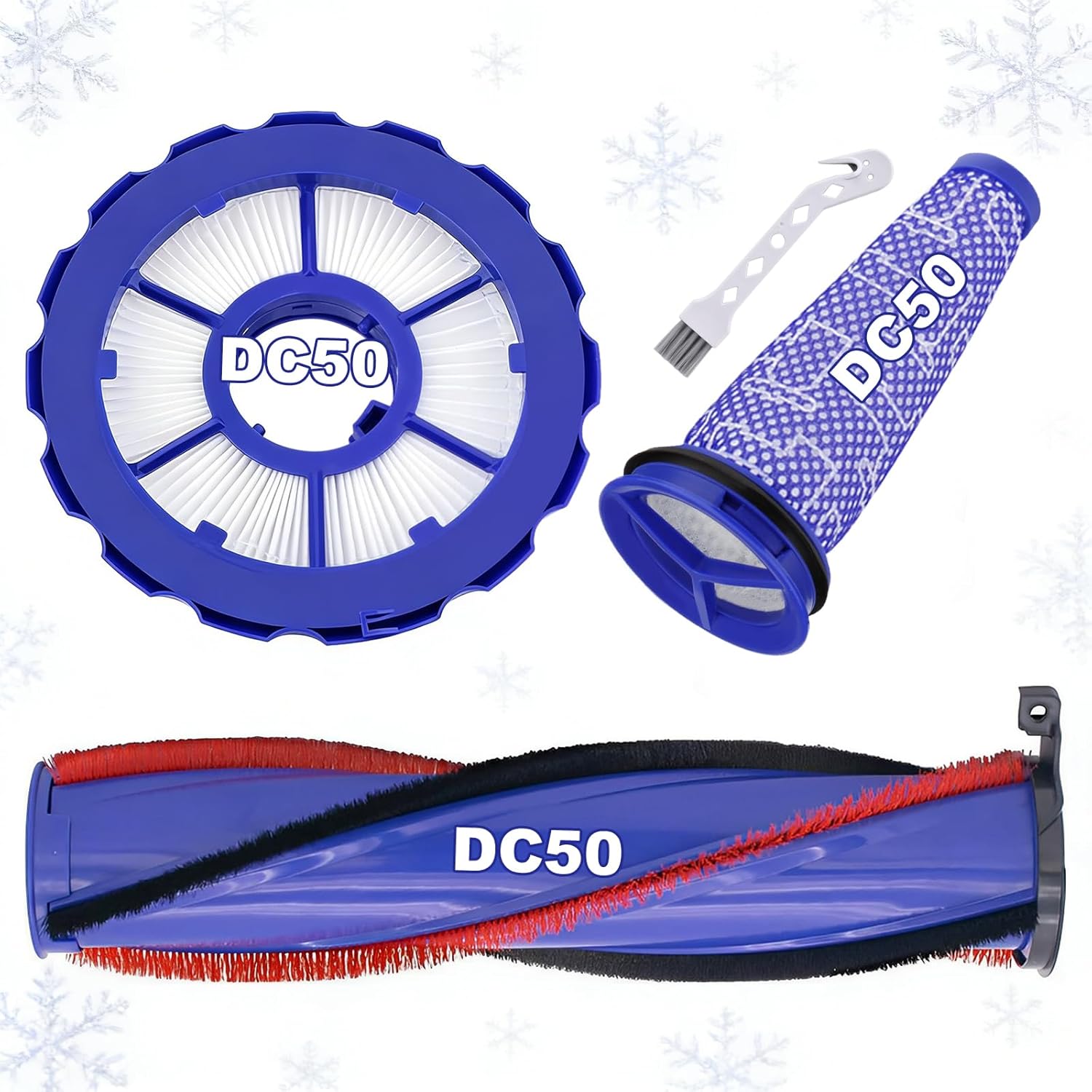 Our brush roller and filter replacement kit is compatible with Dyson DC50 series vacuum cleaner: DC50 Animal DC50 Animal Exclusive DC50 Multi Floor DC50 Multi Floor Plus DC50 Multi Floor Exclusive DC50 Exclusive DC50 Ball Compact Compare to part 964705-01 965081-01 965080 (Please verify your vacuum model before purchasing to ensure proper fitment) Package including 1 Roller Brush 2 Post-Motor Filter 2 Pre-Motor Filter 1 Cleaning Brush This is not an OEM product. The brand names and logos are the trademarks of their respective owners. Any reference to brand names or model numbers for this product is intended solely to show compatibility.