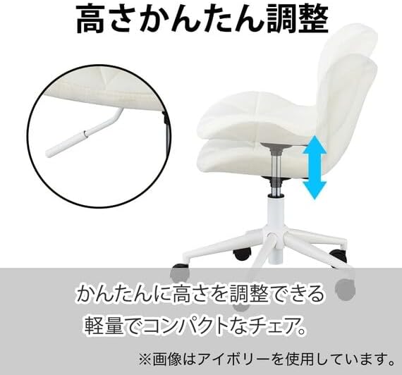 Contoured seat Lightweight and compact design with less pressure The fabric type uses velour fabric with a soft texture. This lightweight and compact work chair can be easily adjusted to match your desk. The design is simple and easy to match with your room. This is a product for general household use. This product is not intended for commercial use.