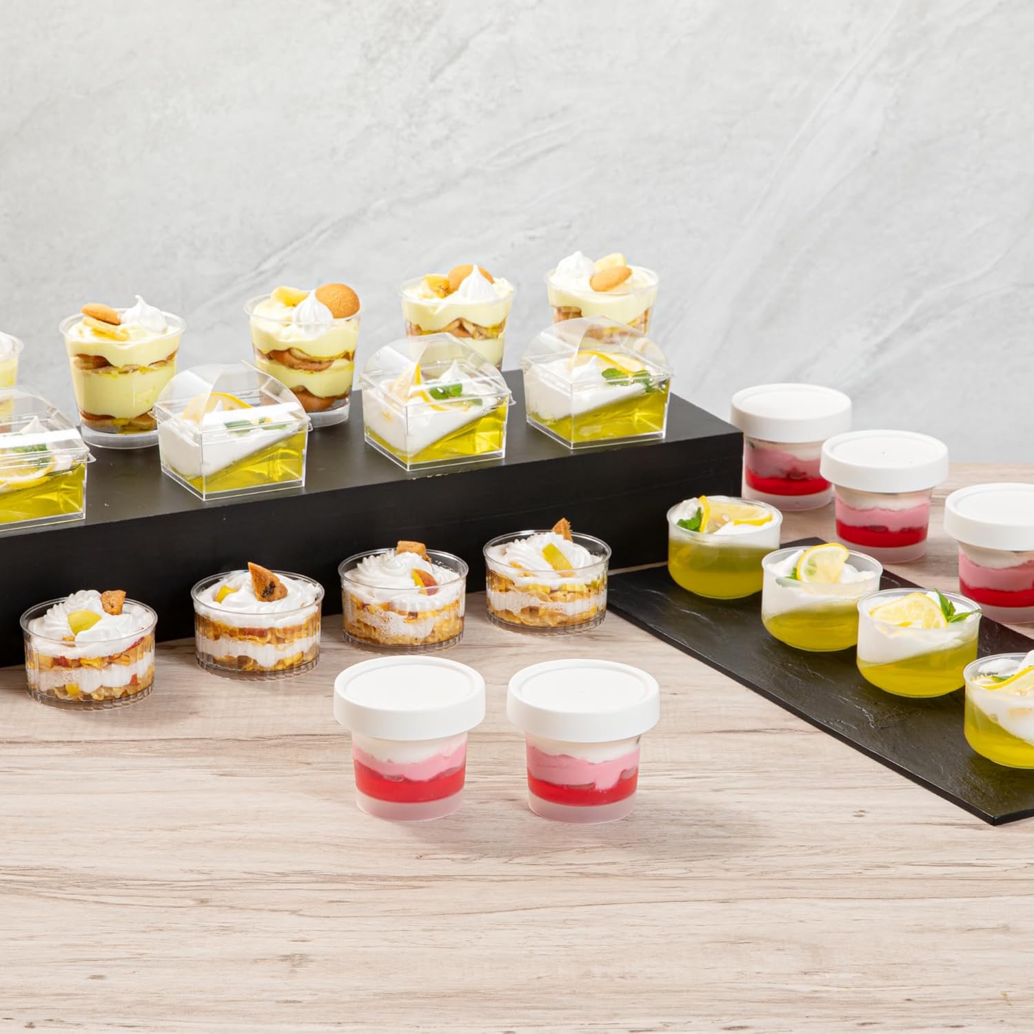 Present your desserts elegantly with our Mini Serve 5-ounce Round Clear Plastic Dessert Cups. Crafted from PP plastic that doesn't contain BPA, these clear dessert cups are designed to withstand hot and cold foods, making them a versatile option for any catered event or restaurant. With the added convenience of being microwavable, these plastic dessert cups allow for quick and easy heating of your delectable treats. Each disposable plastic cup boasts a clear finish, showcasing the layers and colors of your desserts and enhancing the overall presentation. These dessert cups with lids provide a secure covering, minimizing any unwanted spills or messes. The stackable design of these clear dessert cups makes storage a breeze, saving you valuable kitchen space. These plastic dessert glasses are disposable for quick cleanup, an efficient solution for food service establishments aiming for a balance of style and function. Measuring 3 inches in diameter by 2.6 inches in height, these clear plastic dessert cups are compact yet provide ample space with a 5-ounce capacity, perfectly portioning your desserts while maintaining a sophisticated aesthetic. Sold in a 100 count box.