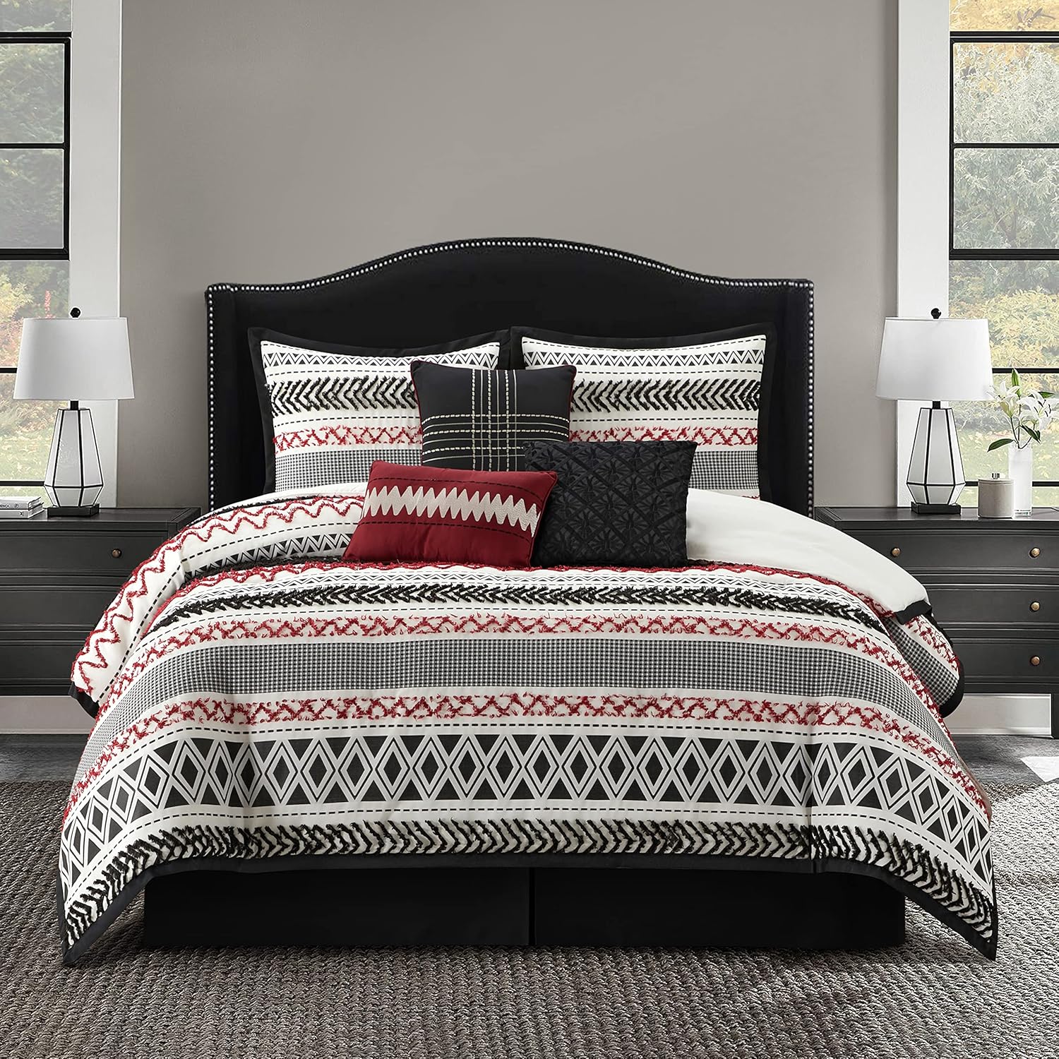 Give your bedroom a modern and luxurious makeover with this beautiful and elegant clipped jacquard comforter set. The super soft bedding is constructed using a washed process for exceptional softness and long lasting durability. Constructed of 100% polyester fabric and filling, this bed set comes with 1 comforter, 2 shams, 1 bed skirt, and 3 decorative pillows that flaunt excellent workmanship and quality. The complete bed set built to last, this bedding set is made with strict quality control standards and comes with everything you need for a complete bedroom makeover. Made with high strength polyester, this beautiful bedding set can be machine washed and dried on a low tumble setting for easy care.